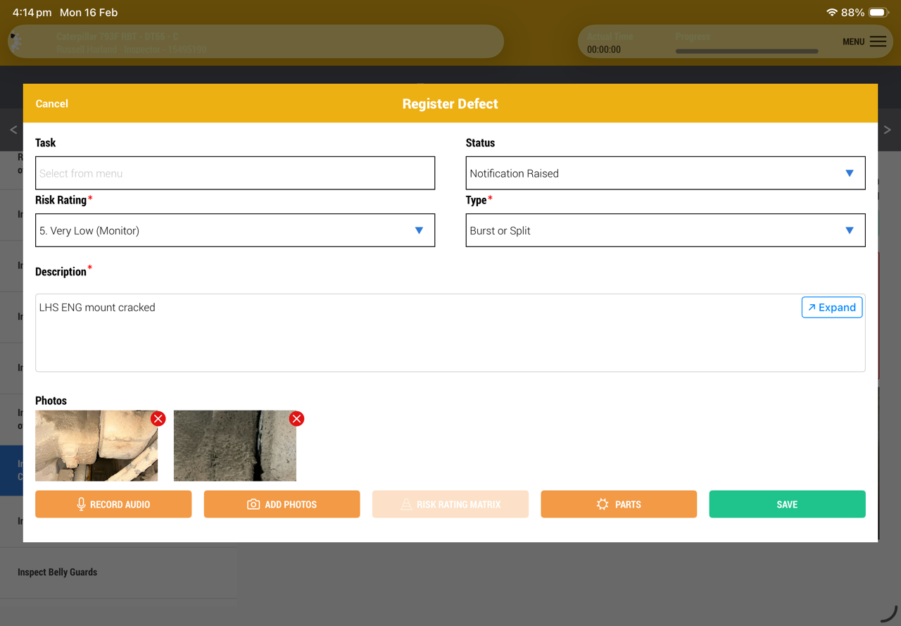 Si un défaut est enregistré, l'utilisateur doit compléter les champs, ajouter des détails supplémentaires sur le défaut et prendre des images pour une inspection future. Utilisez le bouton d'agrandissement pour améliorer la taille de l'écran afin d'ajouter du contenu dans le champ de description.