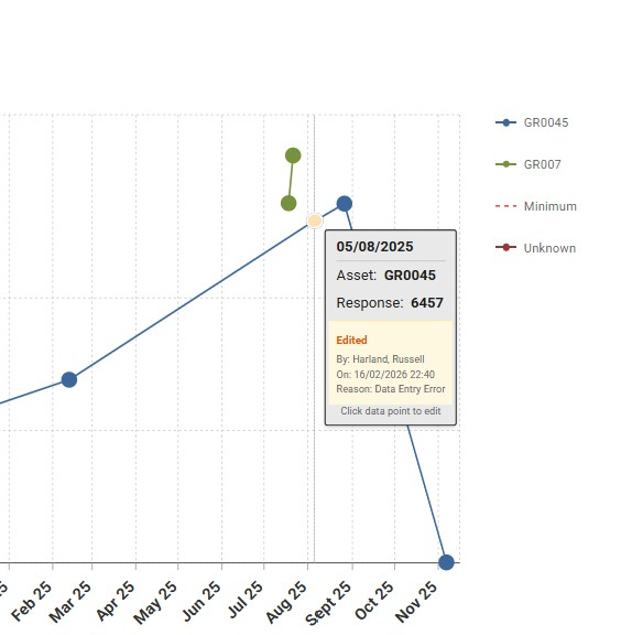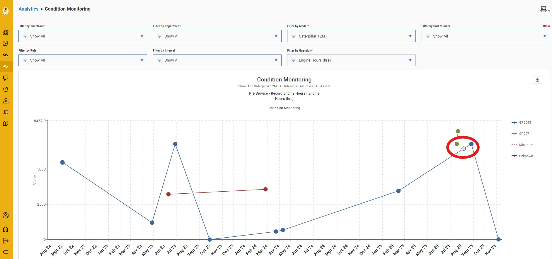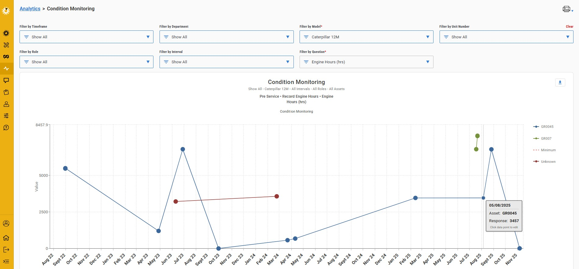 Seleccione el modelo y las preguntas para ver los resultados presentados y los datos recopilados en todos los números de activos. O filtrar a activos individuales.